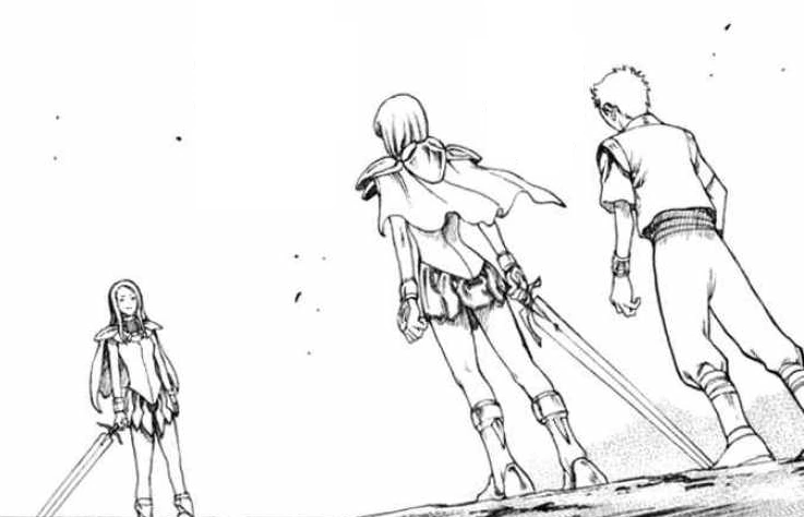 Tras la unión de Raki en el camino de Clare a través del desierto, Raki repentinamente siente un gran hambre cuyo sonido es escuchado por Clare quien le pregunta y este le responde que si, añadiendo también que no había comido nada desde el desayuno y que habían caminado todo el día, era un poco raro de ella no sentir hambre se pregunta Raki. Clare toma su espada y la lanza en alguna parte del desierto atravesando a un lagarto provocando una rara impresión en Raki por el rápido movimiento y Clare le pregunta si servirá eso.