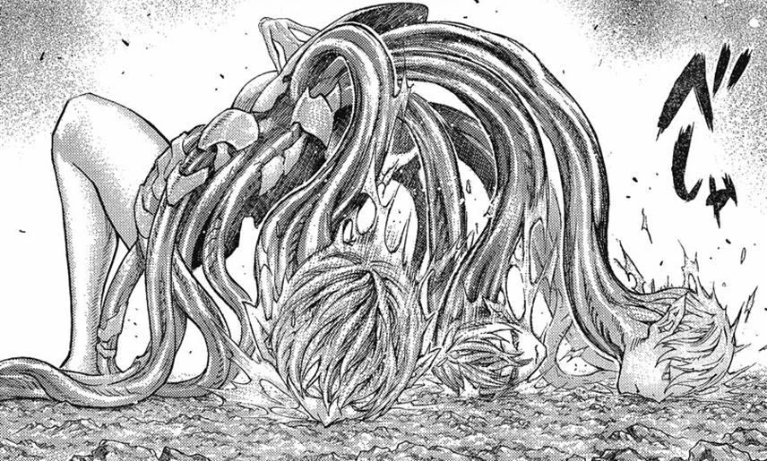 Cassandra a Despertado gracias al trágico recuerdo provocado por Roxanne, Miria e Hysteria quienes peleaban sienten el Despertar, la figura de Cassandra es de un cuerpo femenino desnudo acostado de espalda sosteniéndose de sus piernas y de uno gruesos látigos, Cassandra aparece desde la cintura en adelante desde el pecho de la gran figura, en la parte trasera de esta aparecen tres cabezas similares al de Cassandra, Roxanne se ríe a carcajadas por la apariencia de esta y es atacada siendo todo su brazo izquierdo despedazado de esta, y siendo digerido por una de las cabezas, Roxanne ataca, las gemelas quienes veía sorprendidas, una de las cabezas ataca a una pero es rescatada por Miria, estas se alejan y otra cabeza ataca a Miria, Hysteria también aparece atacando a Miria logrando cortar su brazo izquierdo, entre ataques de las dos, Miria corta su brazo al clavar su espada en el pecho de Hysteria, esta se saca la espada y se dirige donde Miria donde esta la ataca sorpresivamente por haber caído cerca de una espada, afirmándola con su boca, se la clava en el cuello de Hysteria dándola por muerta, Miria va a recuperar su brazo recuperándose, cerca de ella cae Roxanne quien había sido cortada todos sus miembros, esta decide Despertar al igual que Hysteria quien todavía se encontraba con vida, Dae y Rubel quienes se encontraban cerca ya tenían claro los resultados de la batalla, Las cadetes que estaban con Raki dentro de La Organización, ayudan a Raftela y sienten el enorme poder al igual que los hombres de negro quienes ven con preocupación la batalla. Audrey, quien se encontraba herida cerca de Rachel y Nina, les dice a las gemelas que estaban cerca de ella que huyeran, y si era posible que se llevaran a las cadetes con ellas, que usaran el tiempo para disfrutar cuanto pudieran para que sus recuerdos le dieran significado a sus vidas, las gemelas no acepta las ordenes y se van a la batalla. Roxanne había Despertado en una alta y delgada forma, con varios brazos delgados que tenían cuchillas que caían de ella, anuncia su gran apetito y trata de comer a una guerrera, pero esta es salvada por una de las gemelas que corta el brazo de Roxanne y la otra gemela se la lleva, Roxanne va por ella pero se percata de Cassandra, se dirigen unas palabras y se atacan, los múltiples brazos de Roxanne hacen dificultar el terreno pero Cassandra lo esquiva acercándose a Roxanne. Miria rescataba a una guerrera y es alcanzada por Hysteria en su forma Despertar, una extraña forma de cuerpo de mujer desnuda sin brazos y con alas, y su abdomen terminaba en un cuerpo parecido al de un arácnido, esta tenía a dos guerreras que estaban atrapadas en las patas de Hysteria, esta no puede comerlas ya que la espada en su cuello se lo impedía, Hysteria le propone un trato a Miria para sacar su espada pero esta la rechaza incrementando su Yoki, desfigurando más su rostro, ataca a Hysteria y esta salta, Miria va tras ella en el aire pero es automáticamente devuelta a tierra, Miria es recibida por Anastasia con su espada y aparecen las Fantasmas del Norte juntas con Dietrich, Nike y Anastasia, Deneve le dice que estaban para golpearla, Cynthia y Uma ayudan a Miria y Deneve presenta a las guerreras que las ayudaban, le hace una pregunta a Miria que la hace lamentar, Anastasia les dice que el terreno ya estaba preparado y Helen se lanza al aire, Miria queda sorprendida al ver como las guerreras volaban e iban donde Hysteria, Helen utiliza su Espada Taladro pero Hysteria lo esquiva, Nike y Dietrich salvan a las guerreras atrapadas y Anastasia y Helen las atrapan, Hysteria va tras de Helen y es retenida por Deneve, Tabitha logra cortar las alas de Hysteria, esta no se había percatado ya que Tabitha no emitía nada de Yoki, las guerreras van tras ella chocando sus espadas pero Hysteria llega a tierra rápidamente, Miria reconoce lo mal que se había puesto la situación, las alas de Hysteria solo eran un estorbo y utiliza una técnica que la eleva en el aire a gran velocidad sin ser percatada por las guerreras en el aire, Deneve y Nike son heridas gravemente, Dietrich ataca pero no logra darle viendo como Hysteria se movía rápidamente sin ser vista, Uma se percata que Hysteria peleaba en el aire pero se hacían agujeros en la tierra, Dietrich es herida siendo perforada en la parte derecha de su abdomen, Miria descubre descubre como Hysteria se movía a gran velocidad, esta lanzaba una especie de gancho a la tierra creando un movimiento de tracción con el piso, Deneve se va recuperando y les dice a Cynthia y a Uma que ayuden a Dietrich y a Nike, Anastasia es atravesada por el abdomen siendo atrapada por Hysteria como rehén, Hysteria les dice que perdonaría la vida a quien le sacara. Miria intenta dar con una estadística pero no logra concordarse decidiendo querer Despertar pero Deneve extiende su mano y la hace entrar en razón hablándole sobre sus defectos y objetivos, Miria se arrepiente y le extiende su mano a Deneve. Nike acepta el trato de Hysteria de sacar la espada de ella, Miria logra manejar el Vuelo Alado y le pregunta a Deneve por Clare, Deneve le contesta que estaba descansando en la ciudad Santa de Rabona por sobre exigirse en la tierras del Oeste, Miria no dice nada, Nike va a sacar la espada del cuellos de Hysteria y esta la intimida por si tratara de hacer algún movimiento extraño, Mientras Miria tenía ya preparado el plan, Nike saca la espada y libera a Anastasia, esta es rescatada por Deneve y Tabitha, Nike ataca a Hysteria pero esta se va rápidamente perdonando a Nike, Miria cae en la espalda de Hysteria cruzando su espada con ella y esta decide ir por Miria que se eleva en el aire, Hysteria va por ella y Miria se escapa a gran velocidad uniendo cabellos para impulsarse, Nike les dice a las Fantasmas que le dieran prioridad a Anastasia y esta les dice que era imposible que Miria se enfrentara con un Ser Despertado, Deneve les dice que se apuraran en curaran sus heridas y había